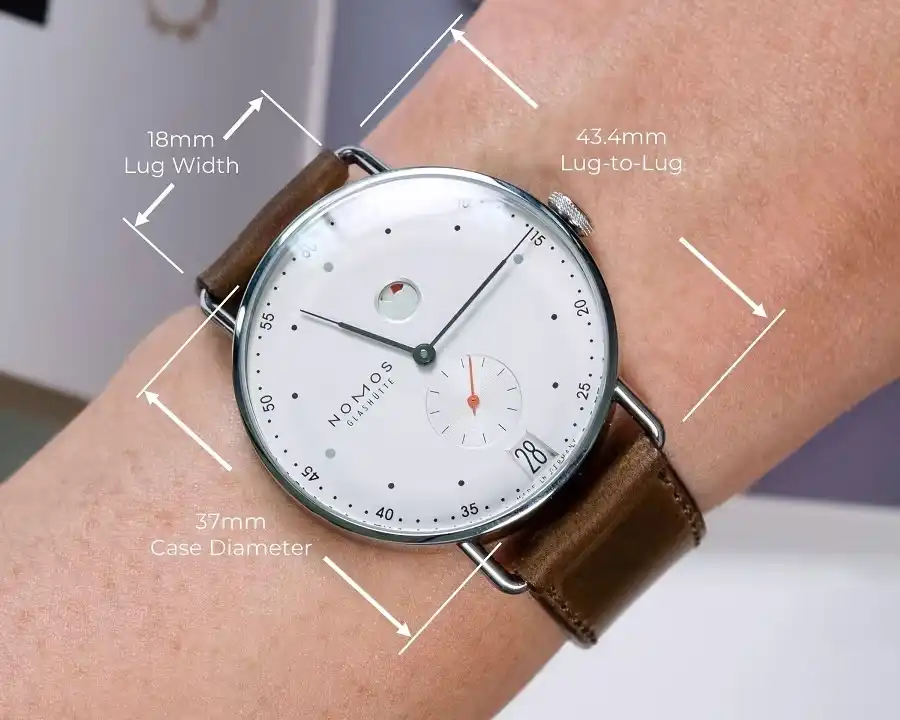 Ví dụ: đồng hồ có đường kính 40 mm nhưng lug to lug là 48 mm, nghĩa là khi đeo, nó chiếm khoảng 48 mm trên cổ tay – ảnh hưởng trực tiếp đến cảm giác ôm và cân đối.