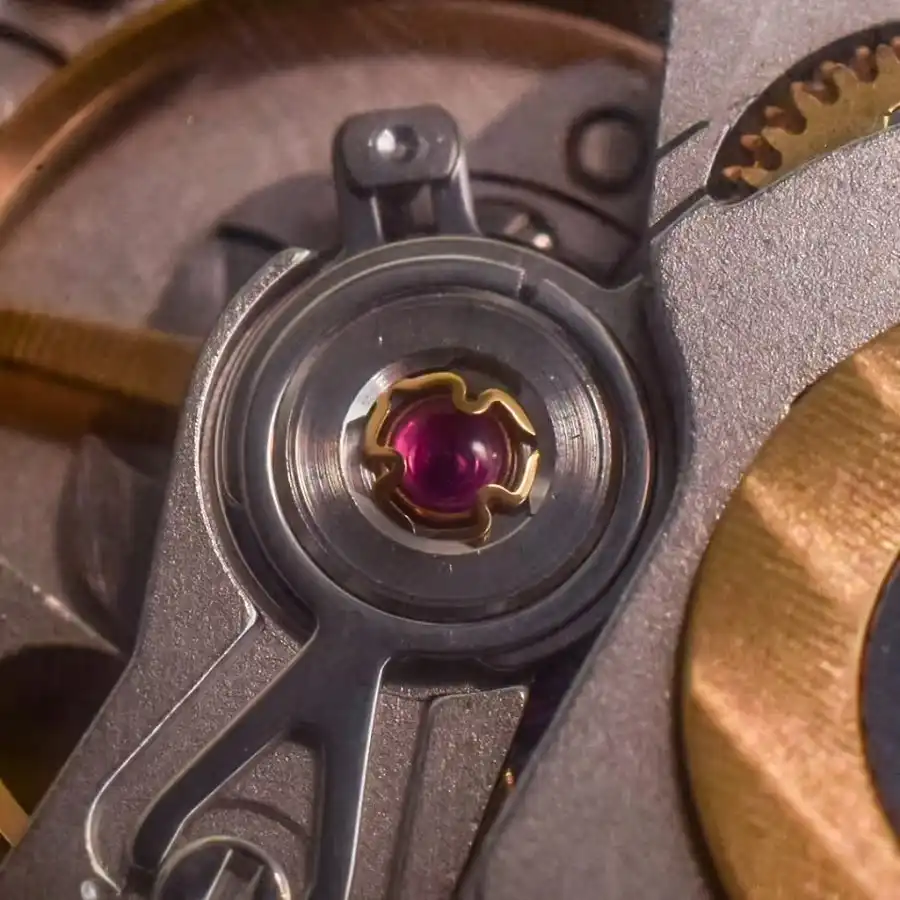 Khi mở đáy (hoặc nhìn qua mặt số nếu bộ máy lộ), bạn có thể thấy ở cầu bánh lắc một cụm tròn gồm cap jewel và một lò xo mảnh:
